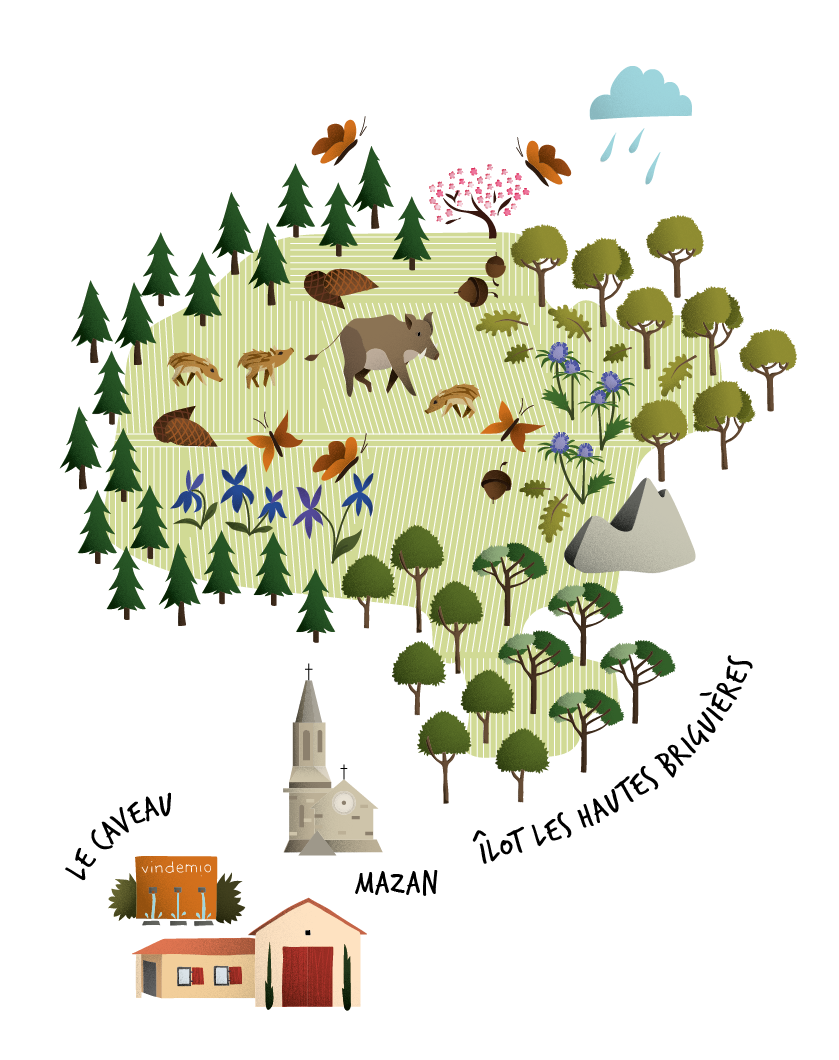 Mais un rien peut modifier en profondeur ce fragile mariage. Il est donc primordial pour nous de faire épanouir nos vignes au sein de ce même équilibre. Là où la nature déploie ses plus beaux atouts : les oiseaux et leur musique, les abeilles pollinisatrices, les cerfs, les sangliers qui libèrent les racines des chênes pour en débusquer leur nourriture et qui s'abreuvent dans les cours d'eau. Aux abords des parcelles, les arbres centenaires, les massifs et les ruisseaux, protègent les parcelles, tels un dôme végétal qui chasse les vents violents et éloigne la chaleur trop intense. Elles sont aussi un écran face aux parcelles voisines.